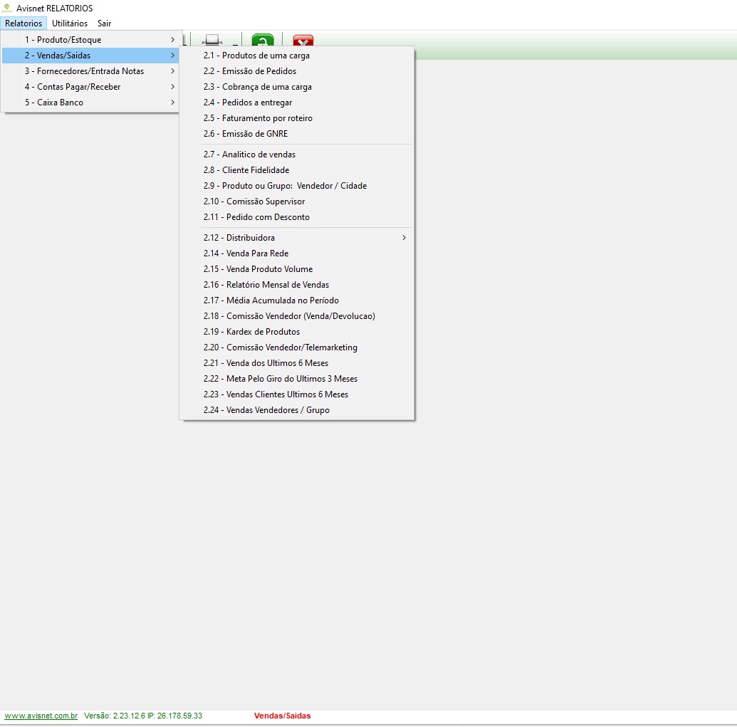 O sistema conta com uma ampla variedade de relatórios, organizados por setores para uma análise detalhada e eficiente da empresa.